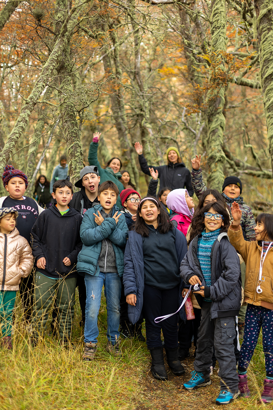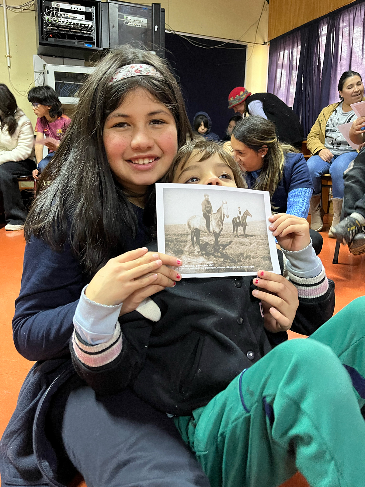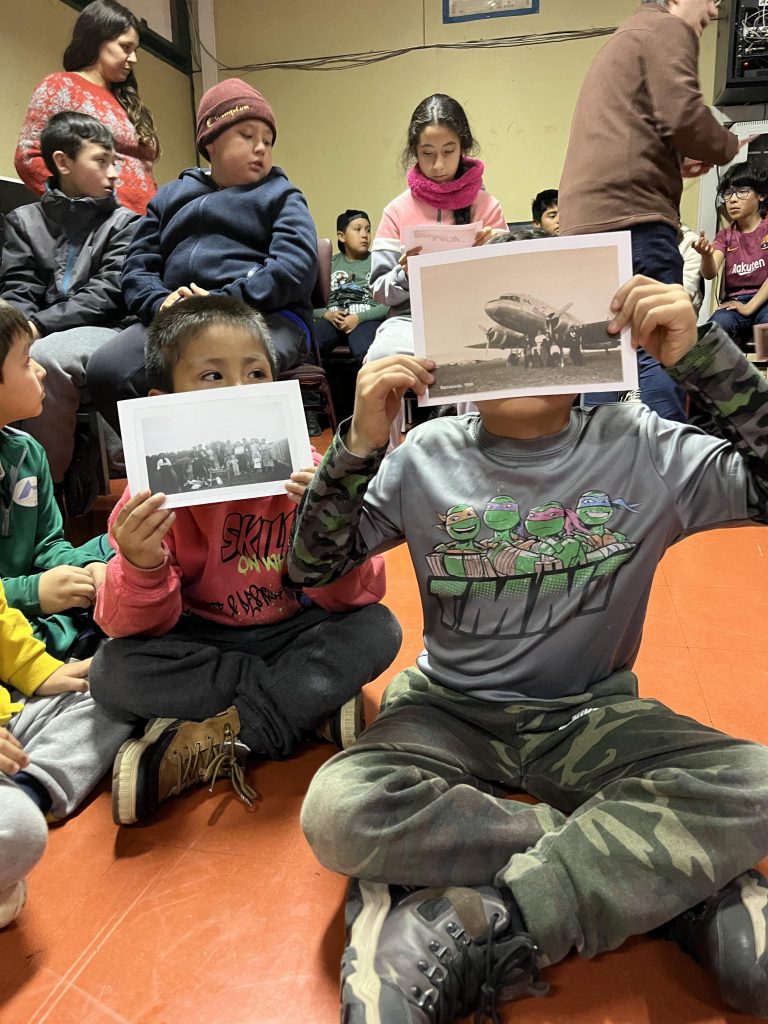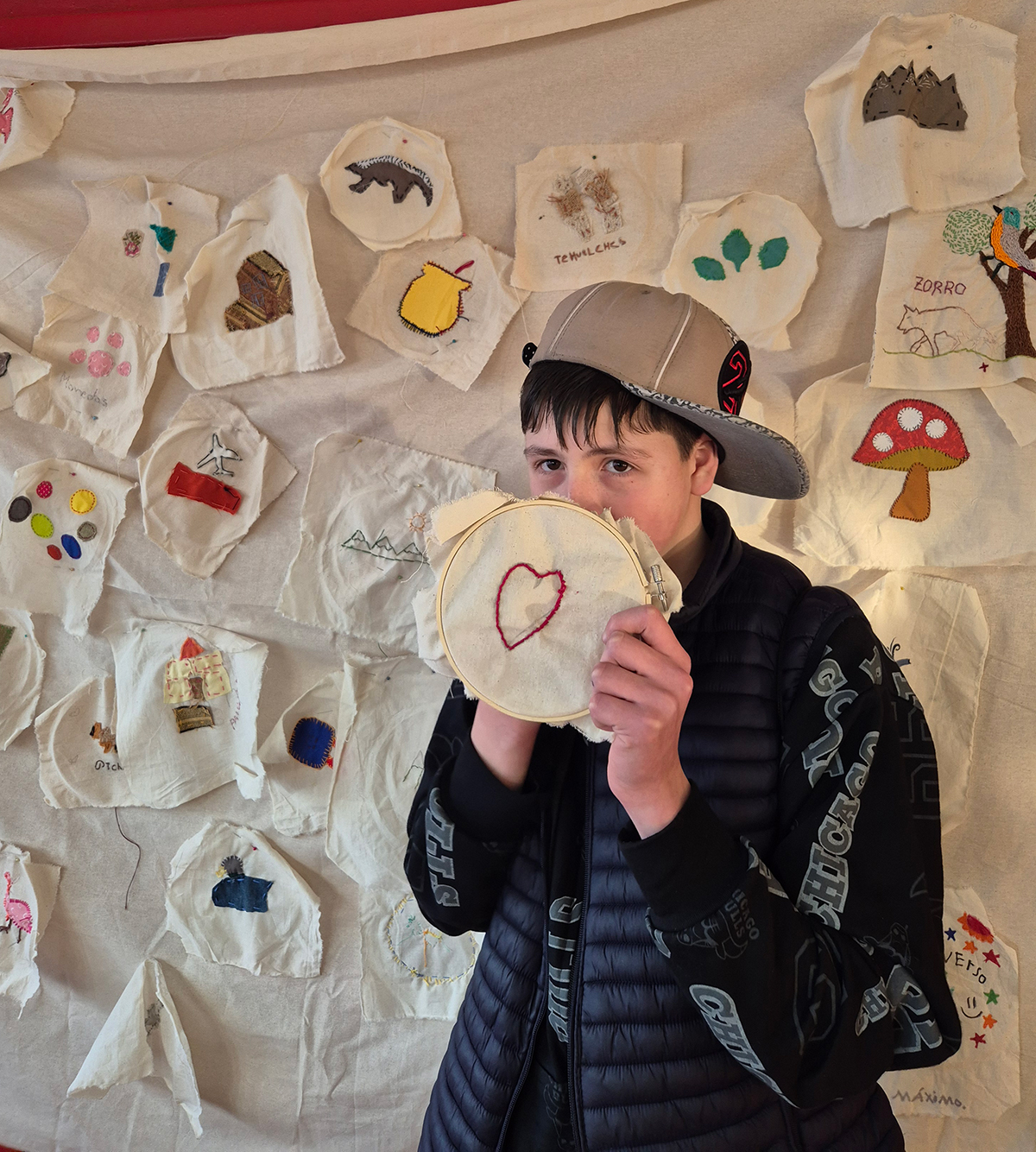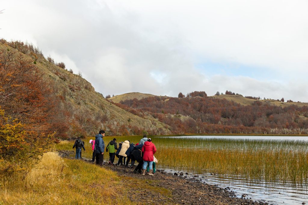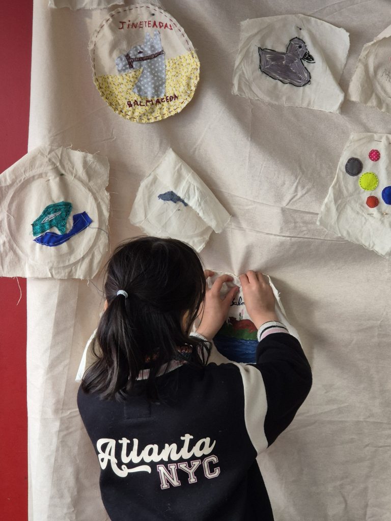 Más adelante, la colaboración con el Museo Regional de Aysén trajo a la escuela objetos patrimoniales —fotografías antiguas, mapas, boleadoras, melodías de antaño— que encendieron la imaginación de niños y niñas, quienes soñaron al “piche prehistórico” recorriendo la pampa. Y en salidas a la naturaleza, junto a Fundación Kreen, los participantes observaron su entorno, transformando en bordados la inmensidad de la pampa, el vuelo de los cóndores, los animales de la vida rural y la fuerza incesante del viento.