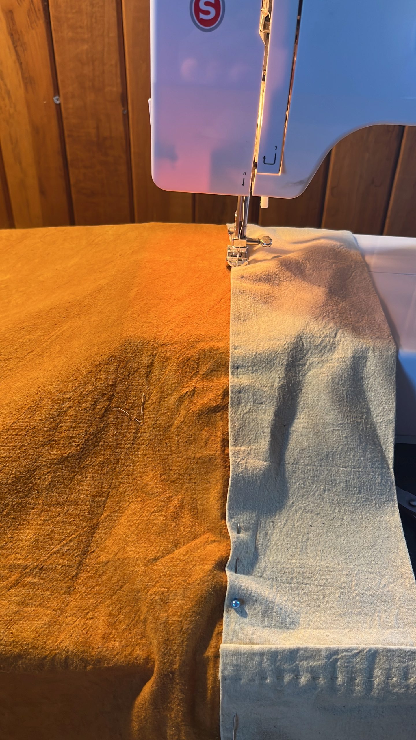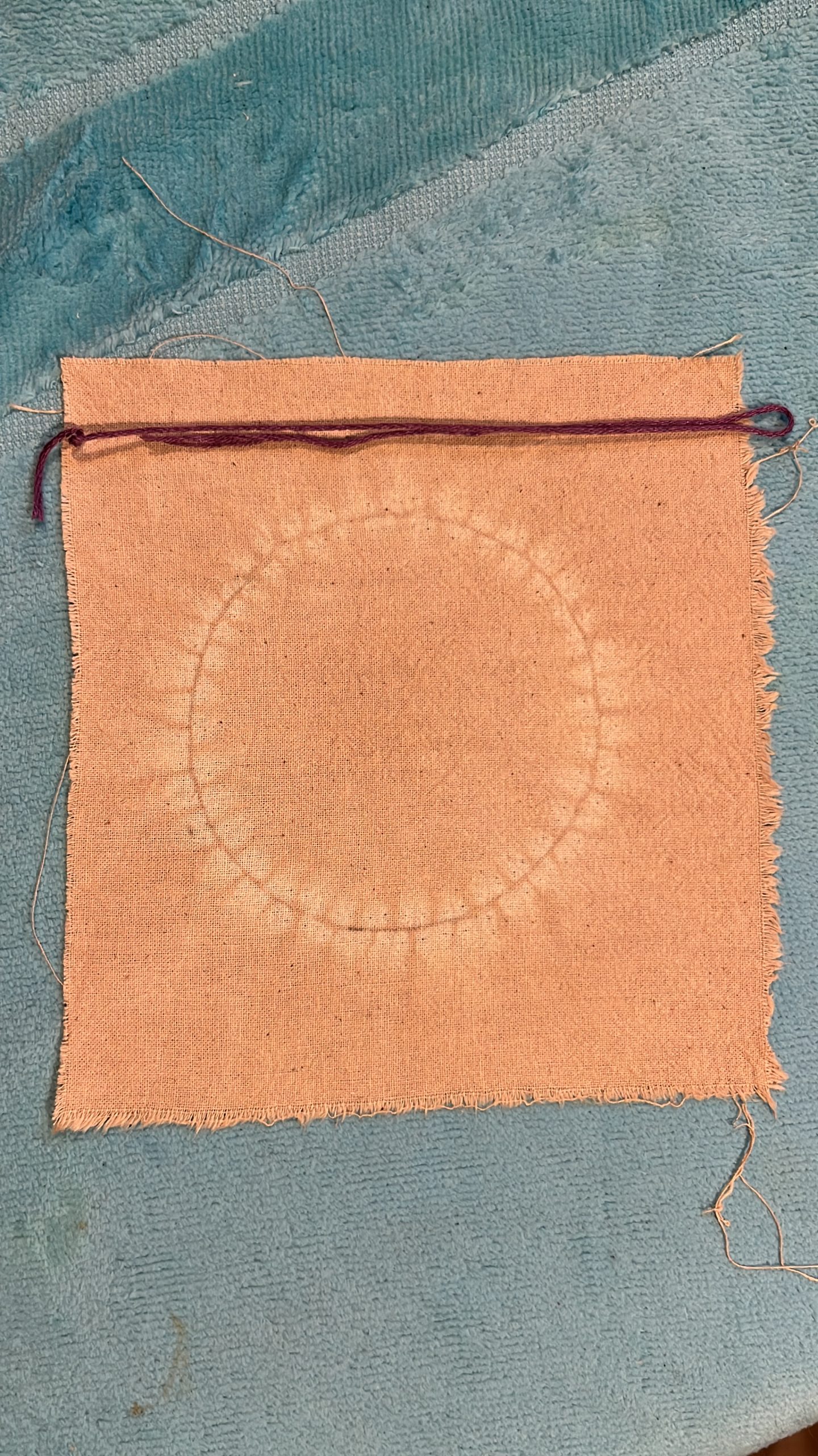 Este proceso fue maravilloso y los resultados muy satisfactorios, elegimos el tinte de cáscara de cebolla (al 300%) para el fondo y el de raíz de calafate (al 50%) para los bordes. Para dibujar el fondo utilizamos la técnica Shibori Mokume, que consiste en coser pliegues siguiendo un diseño, de esta forma el pigmento no se fija donde la tela está costurada. Y finalmente, el punto elegido para luego integrar las creaciones de niños y niñas a la tela fue uno con trazos entrelazados, inspirado en la geometría del neneo, un endémico arbusto protagonista de los paisajes patagónicos. Así la pampa nos permeaba con sus colores, texturas y formas.