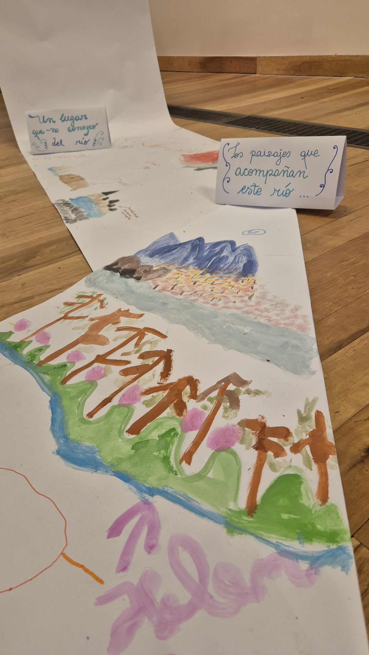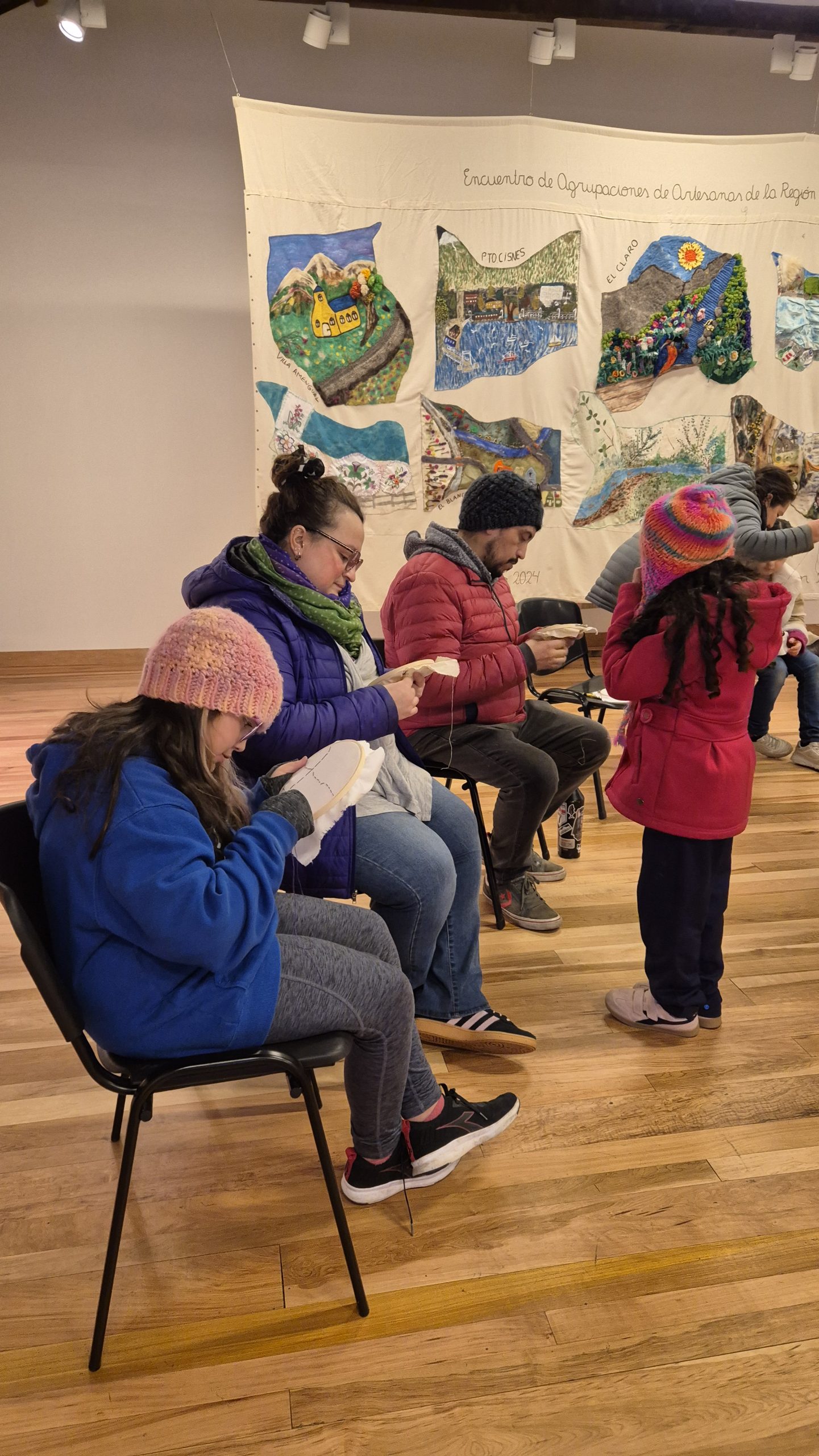 Durante esos días instalamos tres estaciones: Río de papel, Mesón textil y un espacio de los deseos para el río. Fue una invitación a detenernos, a mirar el río con otros ojos y, sobre todo, a escucharlo a través de lo que brotaba en nuestras manos y colores. Macarena Silva estuvo a cargo de generar este espacio de reflexión; Marina Avaria y Paula Ojeda acompañaron con atención y alegría la estación del Río de papel, mientras Ginette Acuña guiaba con ternura a quienes se animaron a bordar su vínculo con el río.