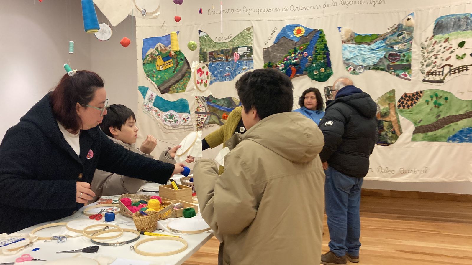 La sala poco a poco se fue llenando de bastidores, muchos de ellos siguiendo la forma del río Simpson, y otros dejando que la imaginación fluyera sin límites, lejos de las instrucciones. Aparecieron montañas, ojos, peces, afluentes, tramas y colores que hablaban del río desde las sensaciones más personales. Cada puntada parecía decir: «el río también pasa por aquí, por mis manos, por lo que recuerdo y por lo que siento».